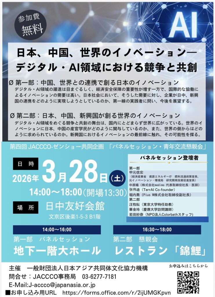 中国5G 2026/3/28 0 Comments JACCO・ゼイショー共同企画「日本、中国、世界のイノベーションーデジタル・AI領域における競争と共創」ディスカッションに登壇しました。議論が面白くて多くの学びがありました。 Screenshot
